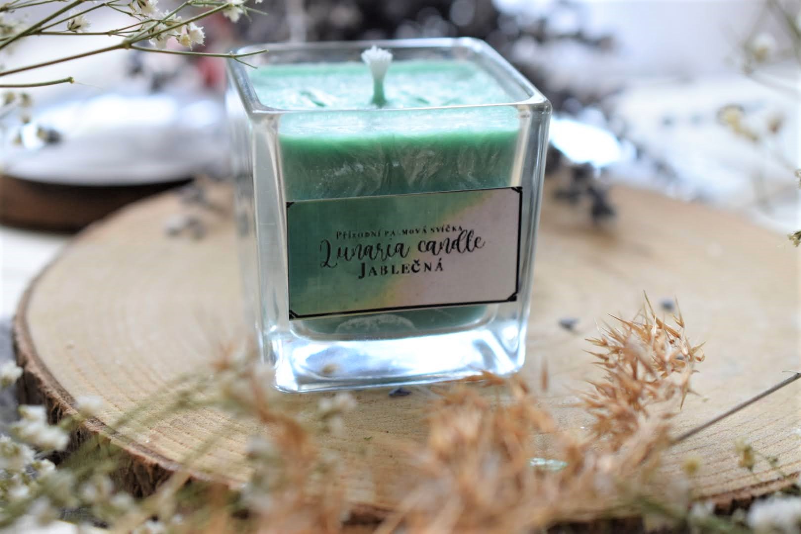 svíčka z přírodního palmového vosku s vůní zeleného jablka ve skleněné dóze