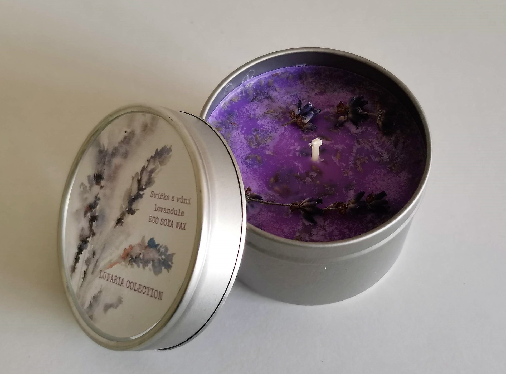 svíčka z přírodního sojového vosku s vůní a kousky levandule v plechové dóze